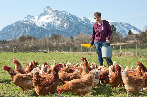 Nähert man sich unserem Hühnerareal, beginnt ein eigener Lebensraum: der Lebensraum unserer Legehühner. Im Verlauf des Vormittags verlassen die Tiere ihren hellen, großräumig angelegten Hühnerstall und gehen ihre Wege im Freilaufgelände. Mindestens zehn Quadratmeter Grünfläche stehen jedem Huhn zur Verfügung. Bewegungsfreiheit fördert in hohem Maß das natürliche Verhalten der Tiere. Immer wieder beobachten Spaziergänger Hühner beim „Sandbaden“. Es ist ein sehr lebendiges Völkchen, um das wir uns kümmern. Artgerechte Tierhaltung ist ein wesentlicher Punkt für die Qualität unserer „Erentrudishof Bio-Eier“.